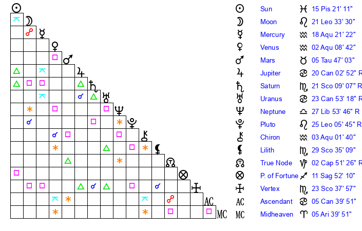 | Moon | 21 Leo 34 | 16 Gemini 40 | 1 Pisces 27 |