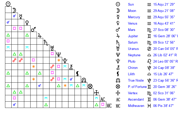 | Saturn | 9 Scorpio 43 | 17 Pisces 46 | 7 Scorpio 21 |