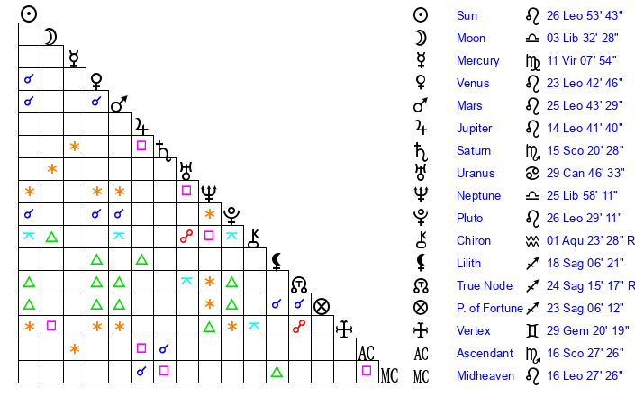 | Sun | 26 Leo 53 | 27 Leo 55 | 5 Scorpio 29 |
