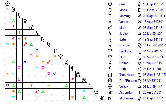 | Venus | 15 Aquarius 54 | 12 Capricorn 37 | 9 Aquarius 4 |