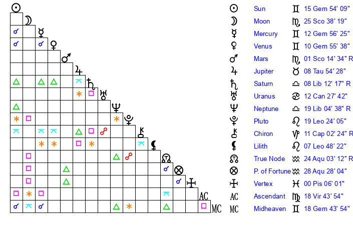 | Sun | 15 Gemini 54 | 16 Gemini 14 | 25 Leo 40 |