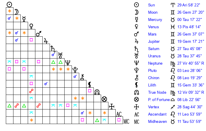 | Saturn | 27 Taurus 59 | 26 Pisces 40 | 8 Gemini 17 |