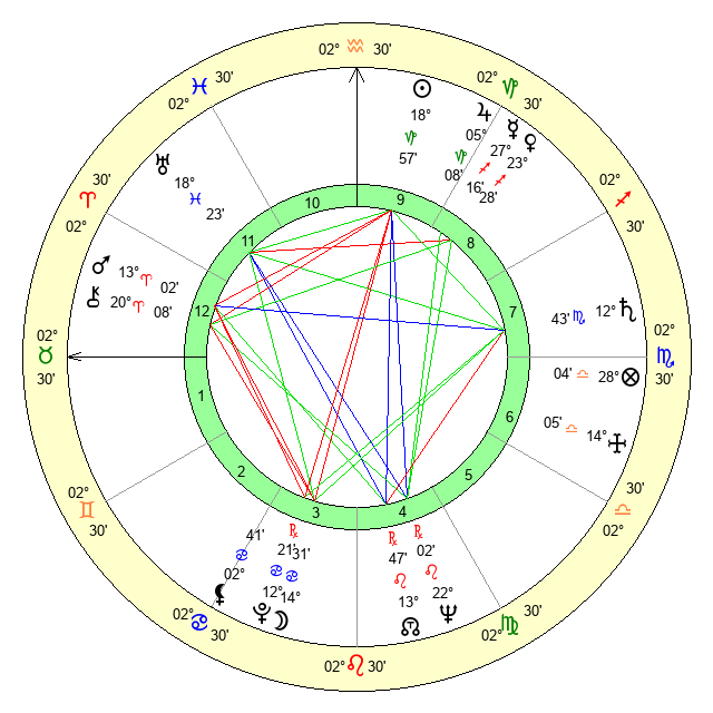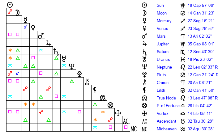 | Mars | 13 Aries 2 | 28 Cancer 46 | 17 Gemini 7 |