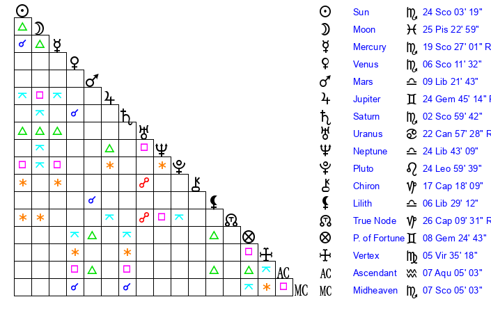 | Moon | 25 Pisces 30 | 15 Libra 38 | 13 Scorpio 18 |