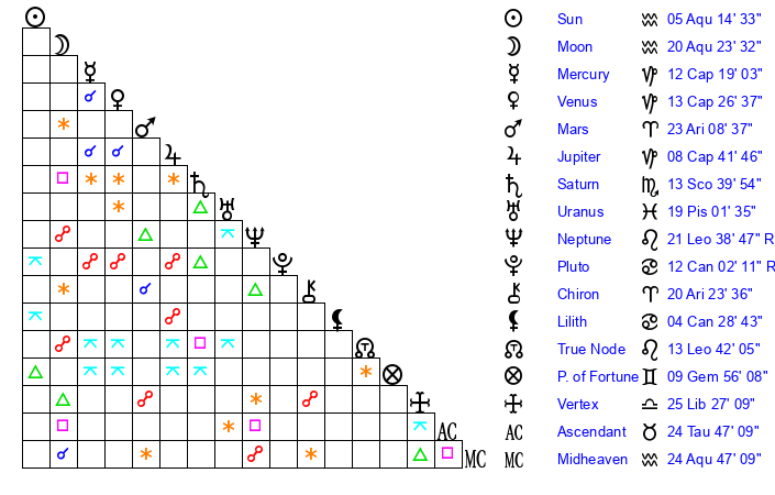 | Moon | 20 Aquarius 23 | 18 Sagittarius 48 | 7 Libra 25 |