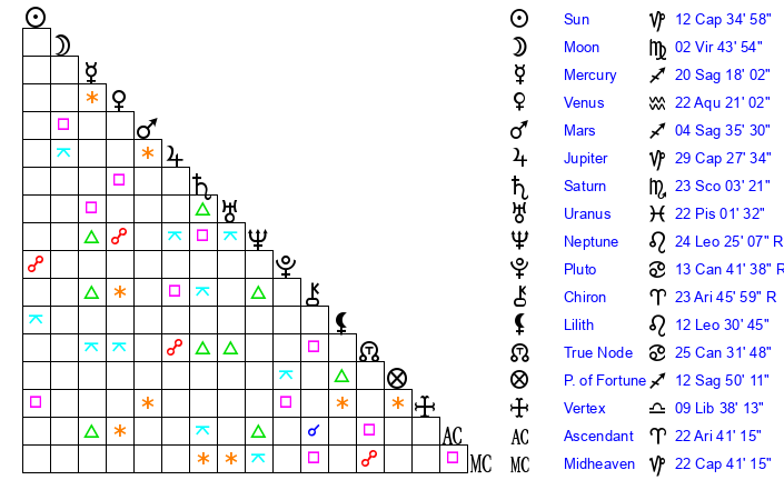 | Sun | 12 Capricorn 35 | 13 Capricorn 34 | 22 Aries 2 |