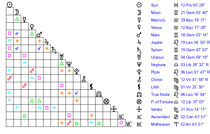 | Sun | 12 Pisces 0 | 12 Pisces 22 | 1 Gemini 27 |
