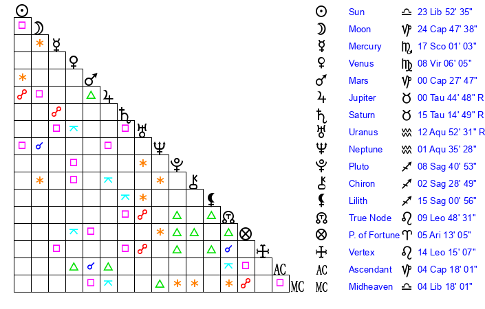 | Sun | 23 Libra 53 | 24 Libra 34 | 19 Scorpio 52 |