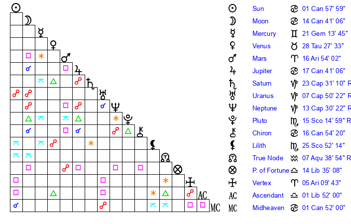 | Moon | 14 Cancer 39 | 8 Gemini 40 | 25 Libra 47 |