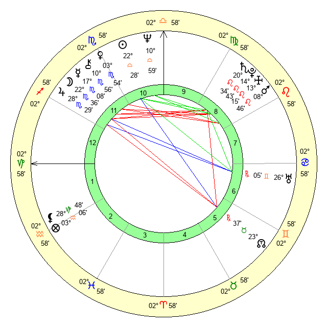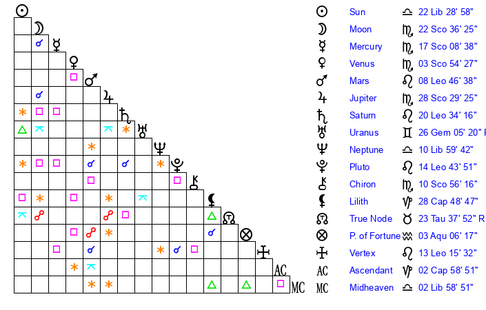 | Moon | 22 Scorpio 36 | 29 Leo 20 | 1 Libra 30 |