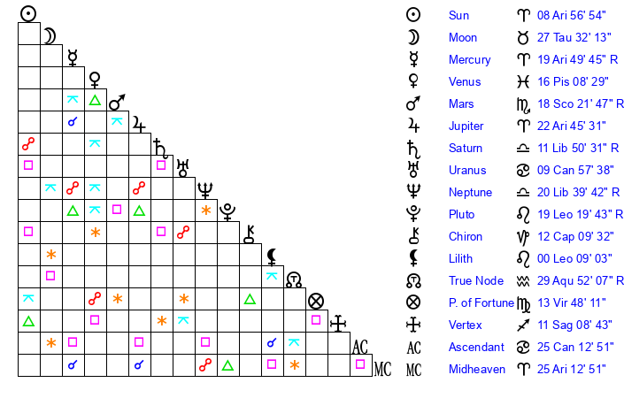 | Neptune | 20 Libra 39 | 29 Pisces 58 | 19 Libra 1 |