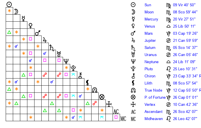 | Sun | 9 Virgo 40 | 10 Virgo 28 | 19 Scorpio 46 |