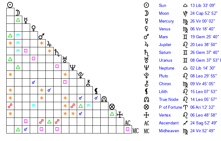| Mercury | 26 Virgo 0 | 1 Scorpio 31 | 24 Capricorn 28 |