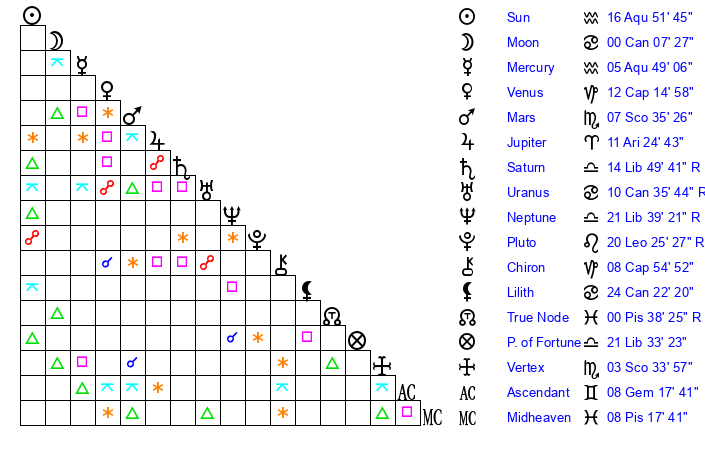 | Sun | 16 Aquarius 51 | 18 Aquarius 9 | 29 Aries 34 |