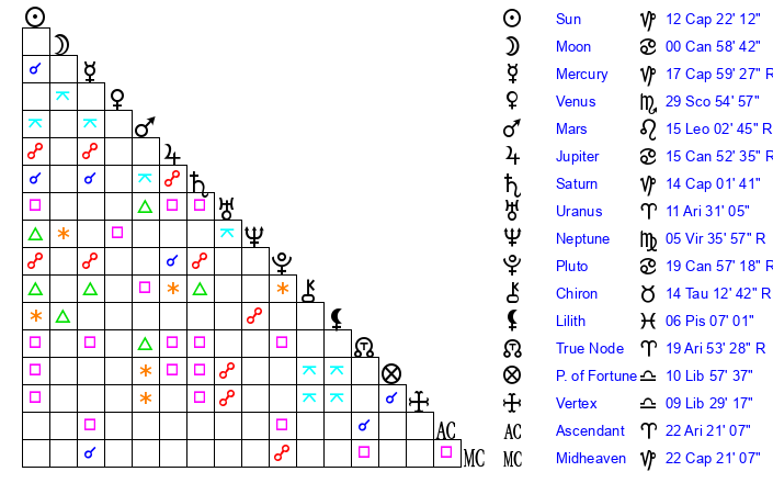 | Sun | 12 Capricorn 22 | 13 Capricorn 34 | 16 Aries 55 |
