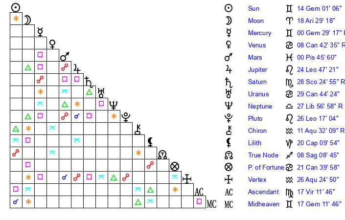 | Sun | 14 Gemini 1 | 14 Gemini 19 | 19 Leo 55 |
