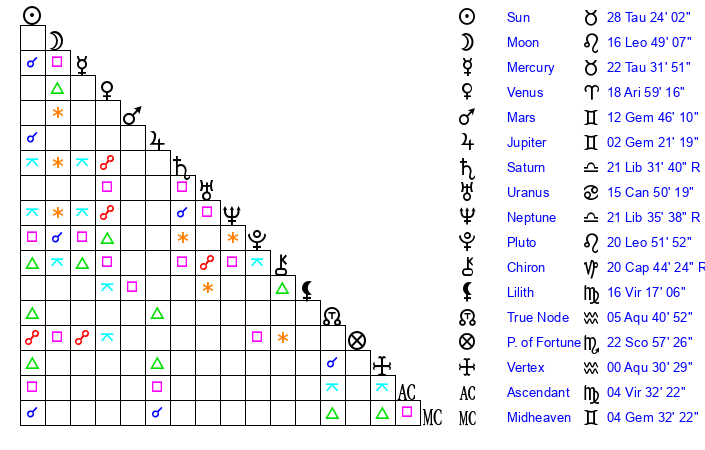 | Sun | 28 Taurus 24 | 28 Taurus 58 | 7 Leo 12 |