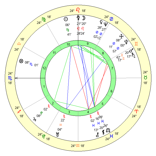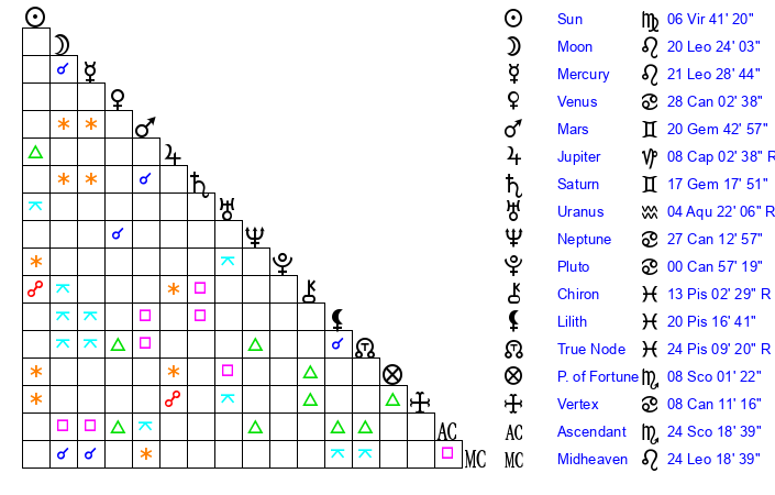 | Moon | 20 Leo 20 | 1 Sagittarius 28 | 28 Virgo 35 |