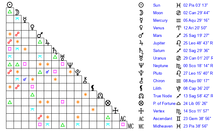 | Saturn | 2 Sagittarius 56 | 19 Pisces 44 | 1 Sagittarius 27 |