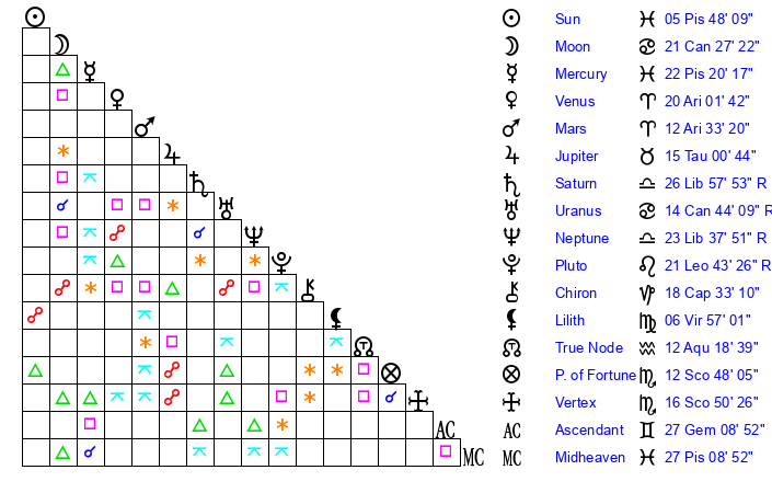 | Saturn | 27 Libra 30 | 20 Pisces 6 | 22 Libra 49 |