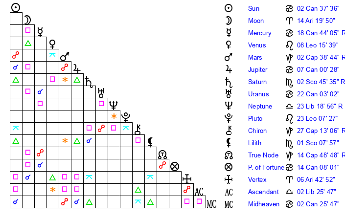 | Moon | 14 Aries 15 | 23 Gemini 25 | 20 Scorpio 55 |