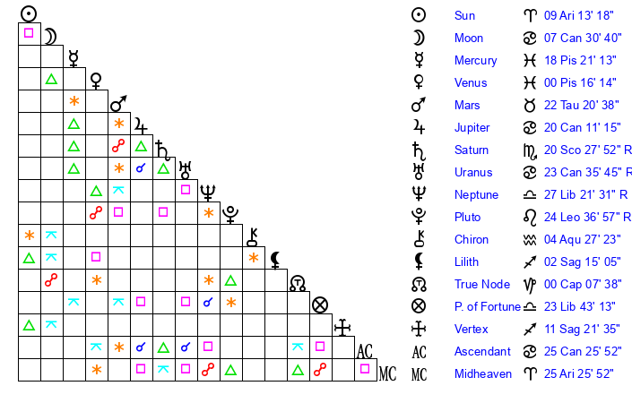 | Moon | 7 Cancer 34 | 27 Aries 55 | 21 Capricorn 11 |