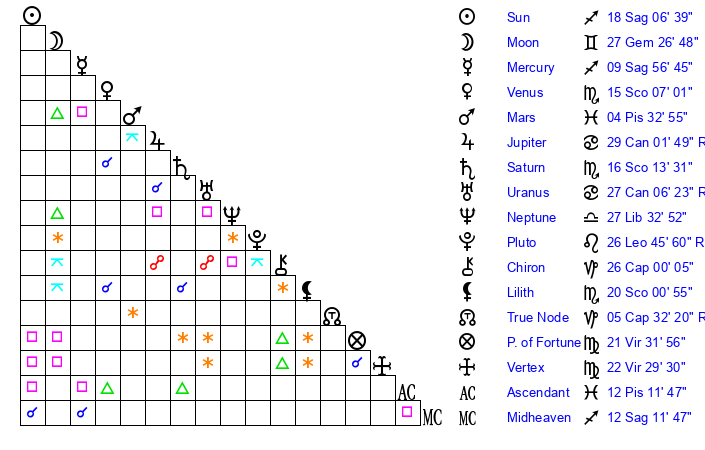 | Sun | 18 Sagittarius 6 | 18 Sagittarius 53 | 0 Pisces 16 |