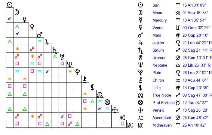 | Mercury | 13 Aries 36 | 27 Pisces 9 | 1 Gemini 21 |
