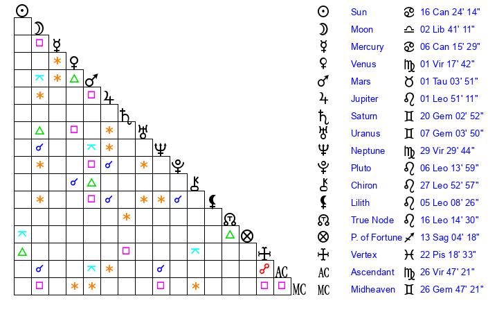 Sun | 16 Cancer 24 | 17 Cancer 32 | 5 Libra 28 |