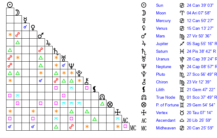 Sun | 24 Cancer 39 | 25 Cancer 22 | 23 Leo 21 |
