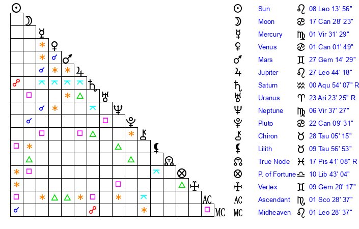 | Moon | 17 Cancer 29 | 29 Libra 51 | 22 Sagittarius 34 |