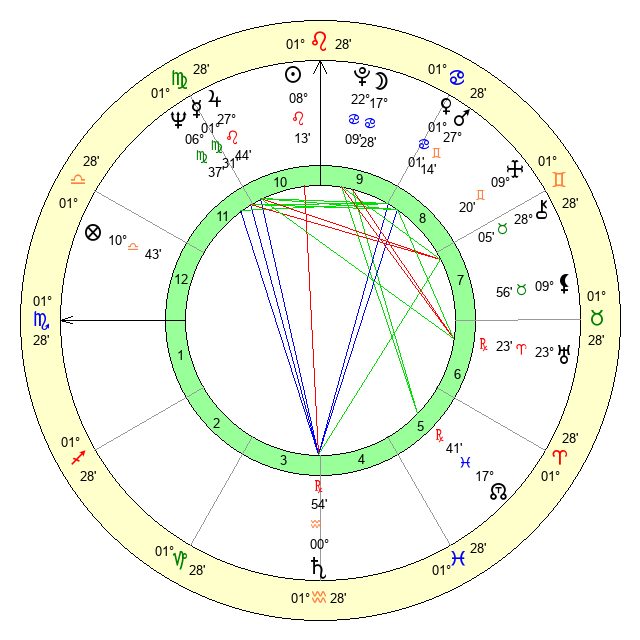 | Mercury | 1 Virgo 31 | 9 Leo 12 | 28 Scorpio 25 |