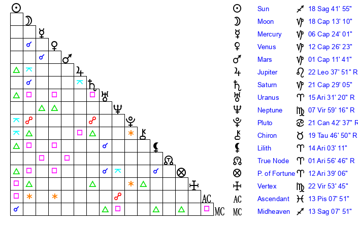 | Moon | 18 Capricorn 15 | 18 Virgo 1 | 14 Gemini 28 |