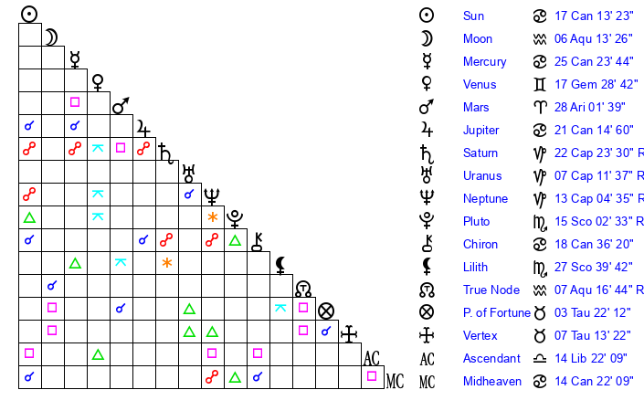 | Moon | 6 Aquarius 20 | 4 Capricorn 16 | 21 Taurus 9 |