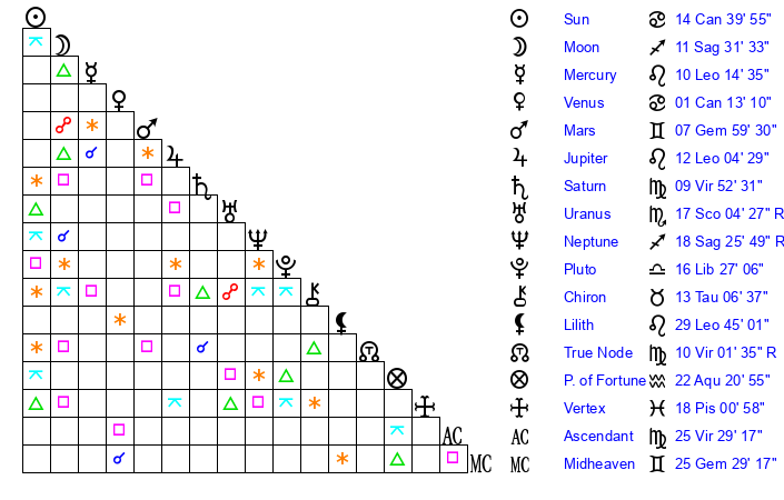 | Moon | 11 Sagittarius 27 | 5 Sagittarius 27 | 24 Leo 58 |