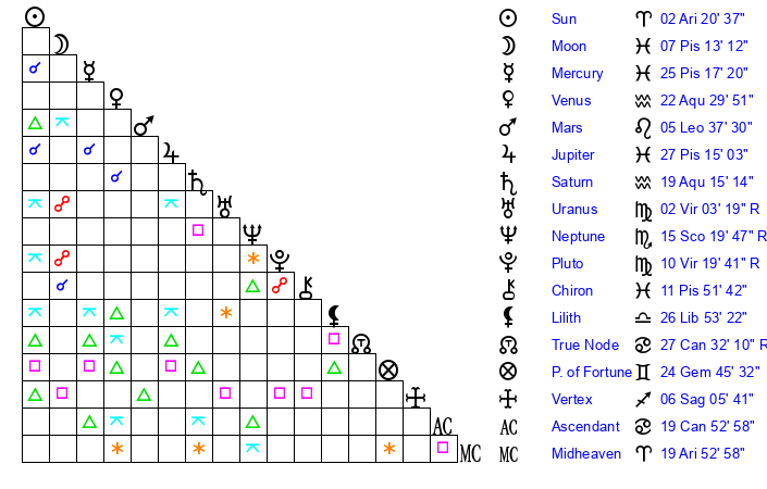 | Saturn | 19 Aquarius 29 | 23 Pisces 24 | 23 Aquarius 16 |