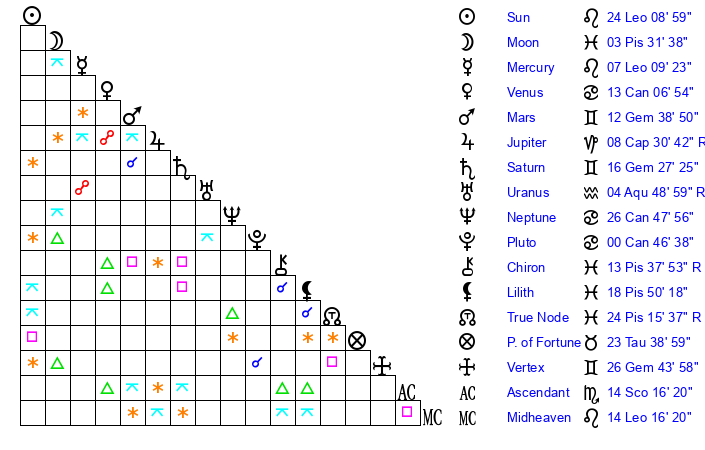 | Moon | 3 Pisces 29 | 14 Gemini 37 | 7 Aries 31 |