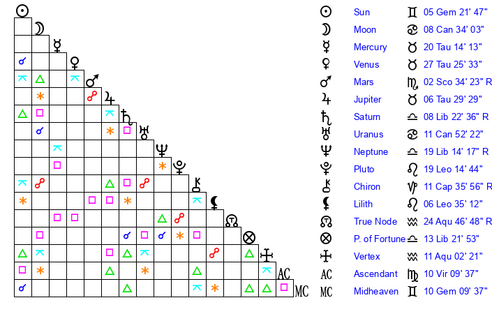 | Sun | 5 Gemini 21 | 5 Gemini 42 | 15 Leo 6 |