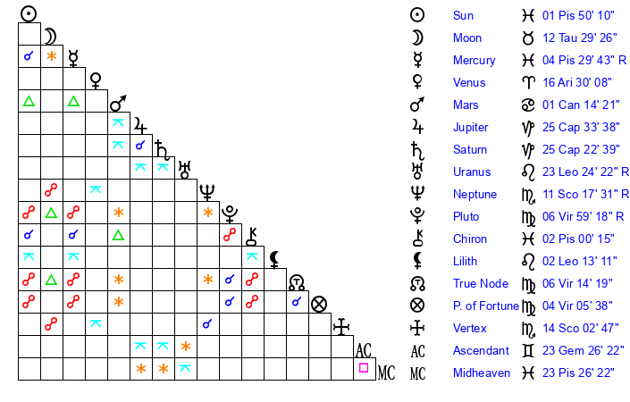 | Sun | 1 Pisces 50 | 2 Pisces 18 | 5 Taurus 14 |