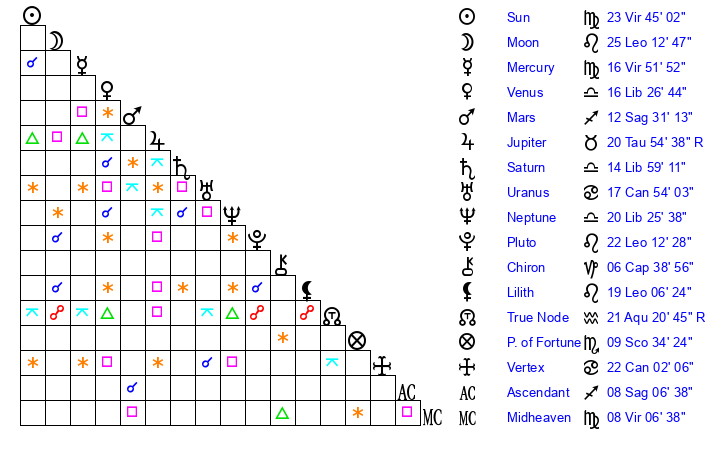 | Sun | 23 Virgo 45 | 24 Virgo 5 | 6 Sagittarius 25 |