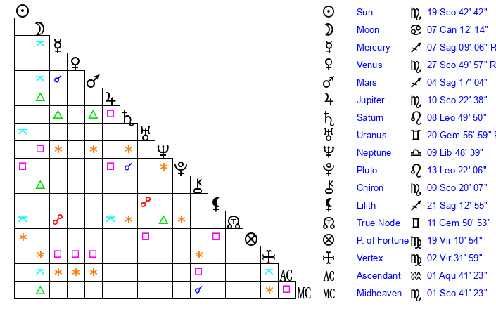 | Sun | 19 Scorpio 43 | 20 Scorpio 34 | 9 Aquarius 58 |