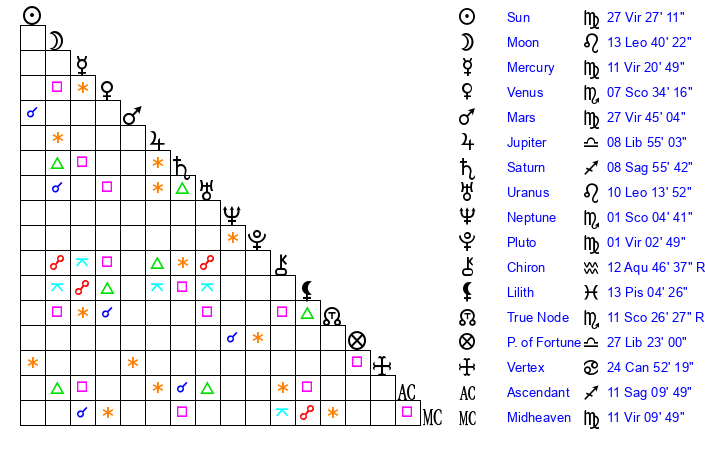 | Moon | 13 Leo 38 | 14 Virgo 58 | 17 Aquarius 57 |