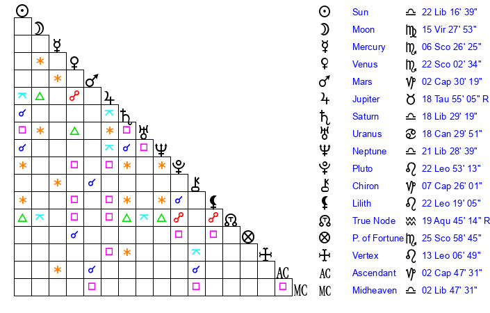 | Saturn | 18 Libra 58 | 26 Pisces 36 | 26 Libra 27 |