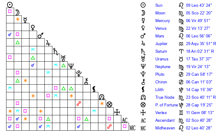 | Sun | 9 Leo 43 | 10 Leo 39 | 4 Scorpio 37 |