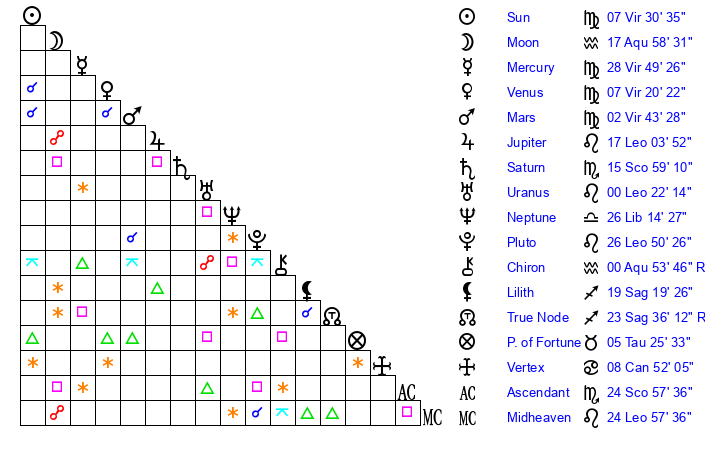 | Venus | 7 Virgo 20 | 7 Leo 12 | 4 Sagittarius 31 |