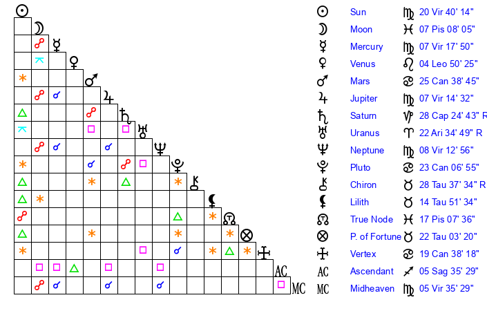 | Sun | 20 Virgo 40 | 21 Virgo 9 | 23 Sagittarius 32 |