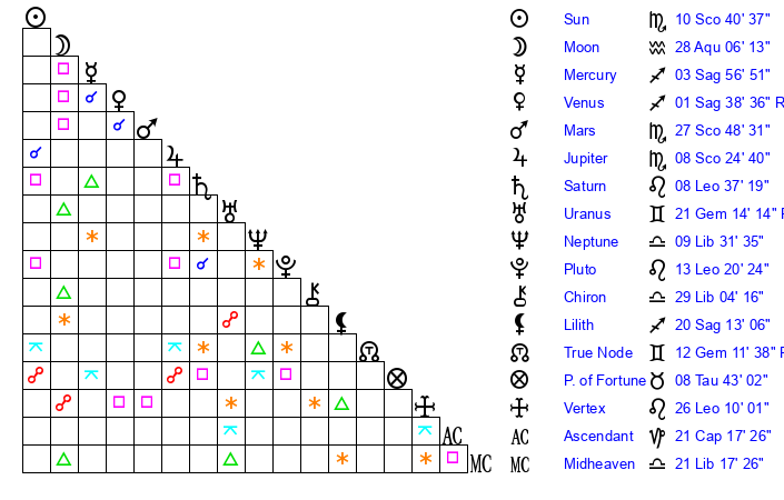 | Neptune | 9 Libra 32 | 29 Pisces 43 | 10 Libra 47 |