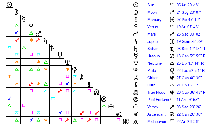 | Neptune | 25 Libra 13 | 29 Pisces 51 | 23 Libra 30 |