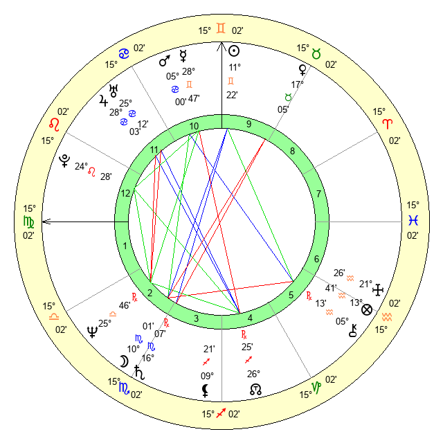| Moon | 9 Scorpio 59 | 7 Virgo 26 | 26 Taurus 1 |