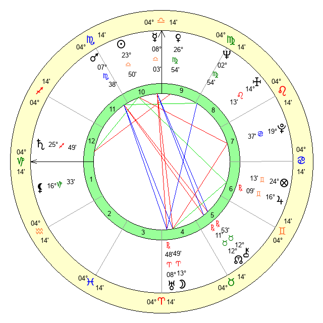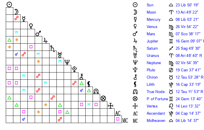 | Moon | 13 Aries 50 | 11 Virgo 53 | 1 Scorpio 20 |